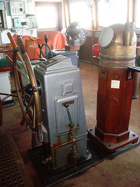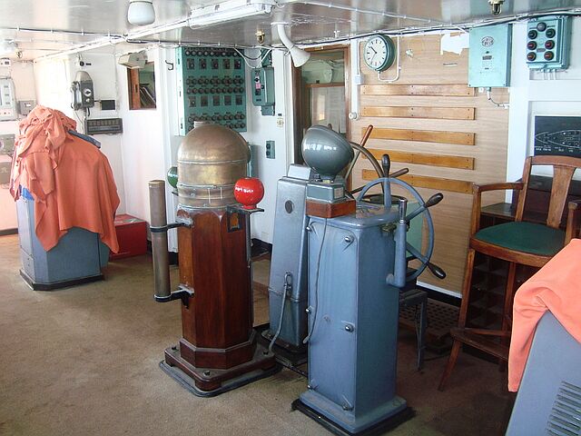 original wheel, compass and telegraph – looking forward to port