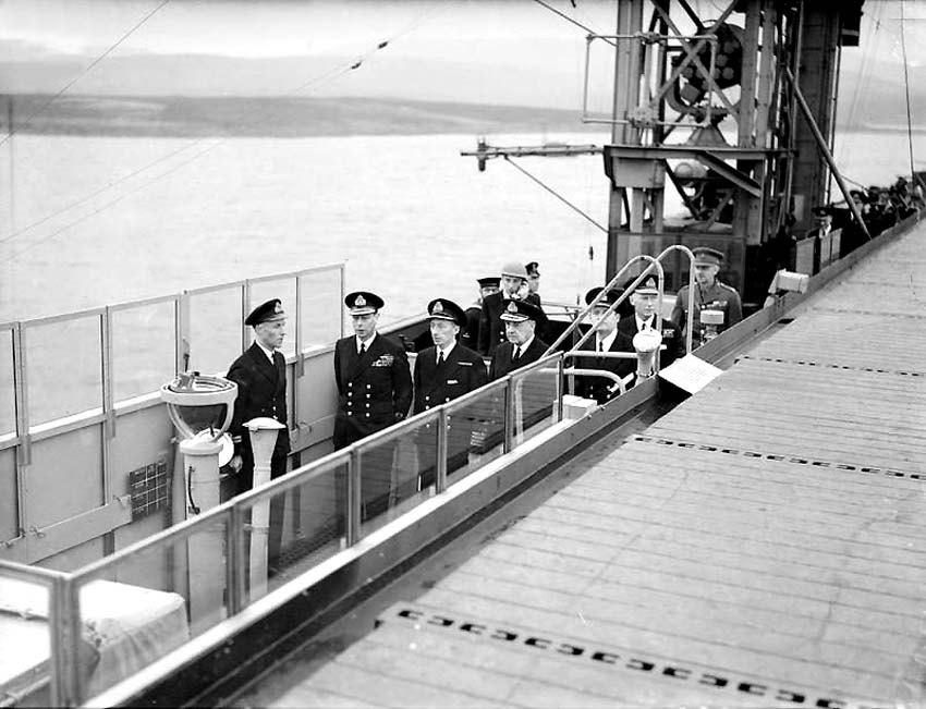 HRH King George VI is seen on the portside Bridge Wing and on his left is the captain of HMS Archer, and the