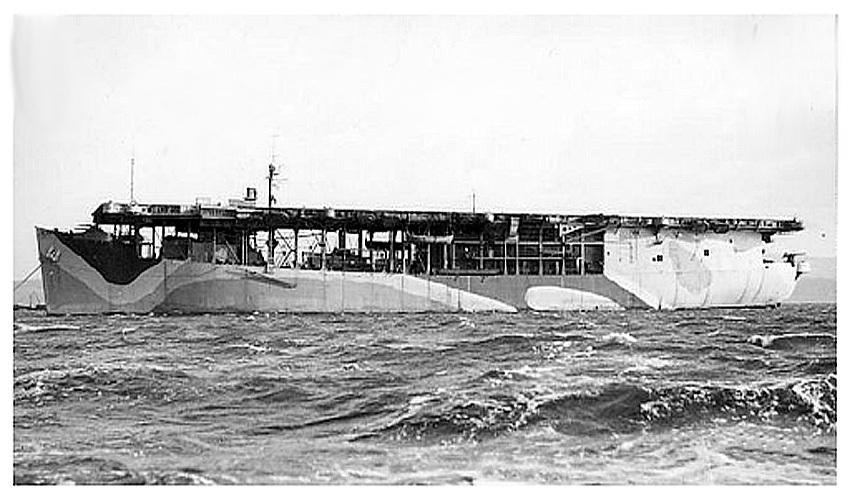 Obviously her original funnel had to be removed and it was replaced by a system that split the exhausts into two deck level vents which emerged amidships on either side of the flight deck. Although this concealed the funnel and reduced her silhouette, it did cause some problems for when she was steaming at maximum speed, being necessary for flight operations, her diesel engines tended to produce volumes of black smoke that at times could completely obscure the visibility of flight deck, if fact, so much so that pilots could see neither the batsman and at times not even the part of the deck where they had to land.