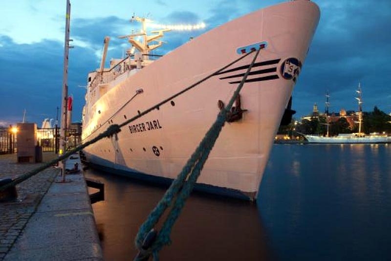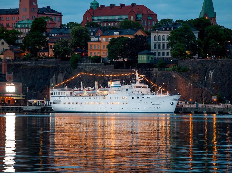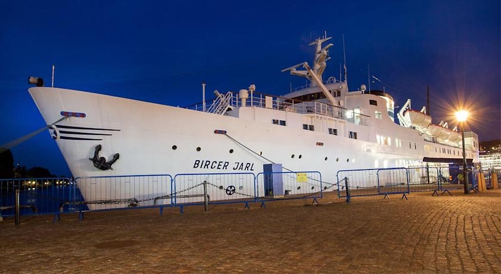 The spotless and superbly maintained MS Birger Jarl is seen at night