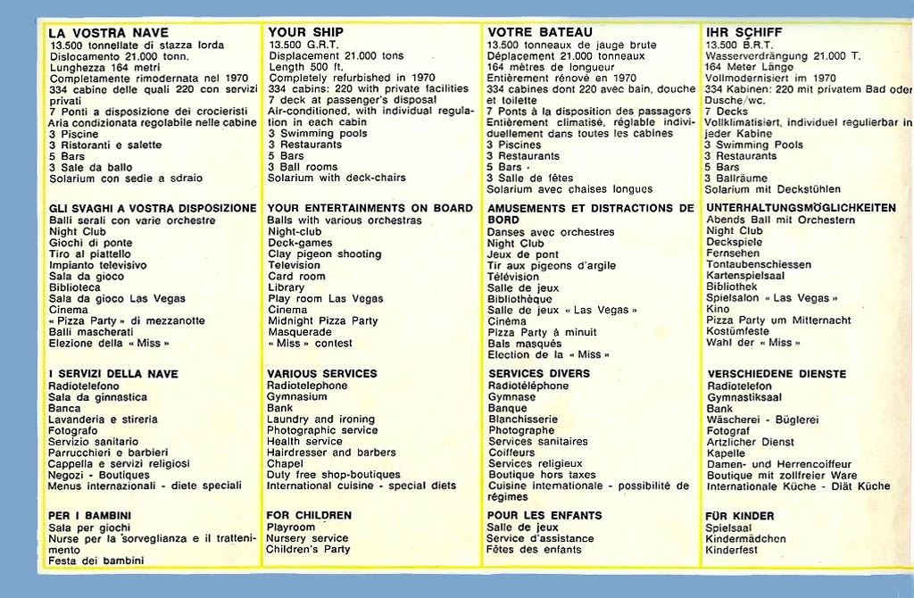 Welcome to Part Three of this special feature, and this page deals mostly with the Grimaldi Siosa Lines liner and cruise ship the Irpinia seen after her first transformation in 1955 with her two funnels, as well after she was extensively rebuilt, becoming a single funnelled ship and re-engined with Fiat Diesel motors as well as having her interiors completely rearranged ending with an amazing 14 public venues.