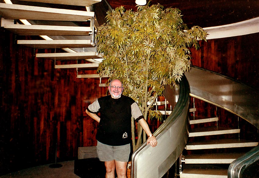 seen standing in front of the famed spiral staircase forward of the Meridian
