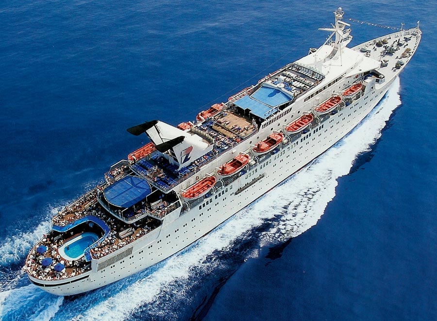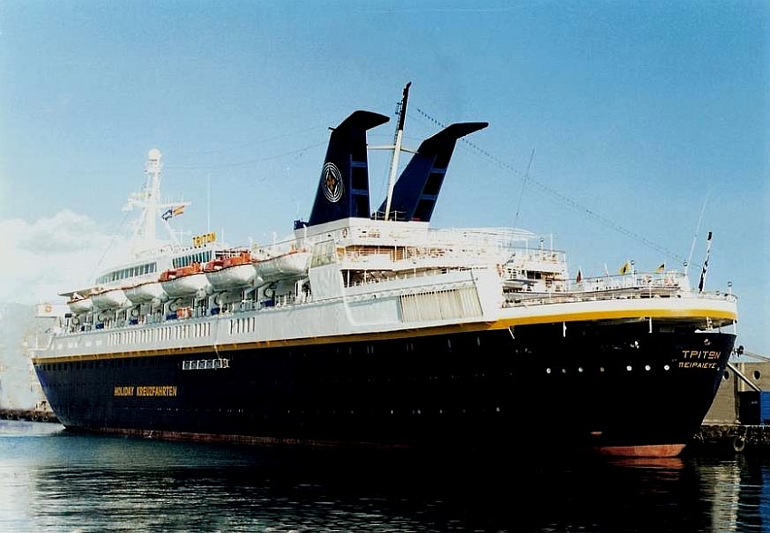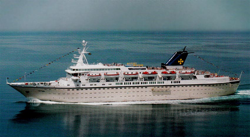Klosters Cruise Ltd, Nassau sold the MV Sunward II in 1991 to my dear late friend George Potamianos who was part of the one of the oldest Greek shipping companies that goes way back to 1850, out of which came the famed “Epirotiki Steamship Navigation Co, SA.,” of Piraeus, who now owned the Sunward II, but she was renamed the Triton. She received the company’s traditional livery a buff hull and a white superstructure, her funnel was blue with the Epirotiki logo being a Yellow Byzantine Cross.