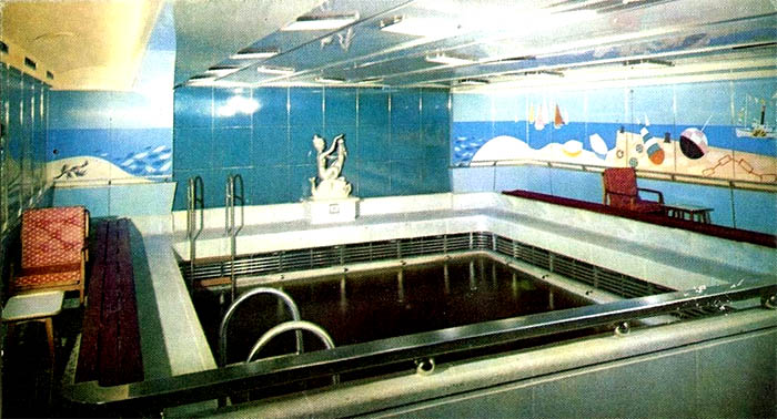 Like her sister the Empress of Britain, for a ship of her size she had rather a long and a very low profile. The majority of her public rooms were arranged on the Promenade Deck, First Class lounges were located forward and Tourist Class aft. The venue located furthermost aft being the Cinema which was shared by both classes. Up on Boat Deck located forward directly under the Bridge, was another of the First Class Lounges, that had large windows along the aft wall over looking a sheltered Sun Deck.