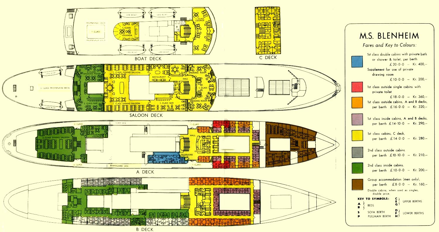 On Page One you will have read the history and details of these two wonderful and rather futuristic ships considering they were completed in the early 1950s, but it is now time for you to discover their interior layout. Sadly these deck plans do not show Bride Deck, however, I believe that the description, delivered in the M/S Blenheim section does, well - say it all!