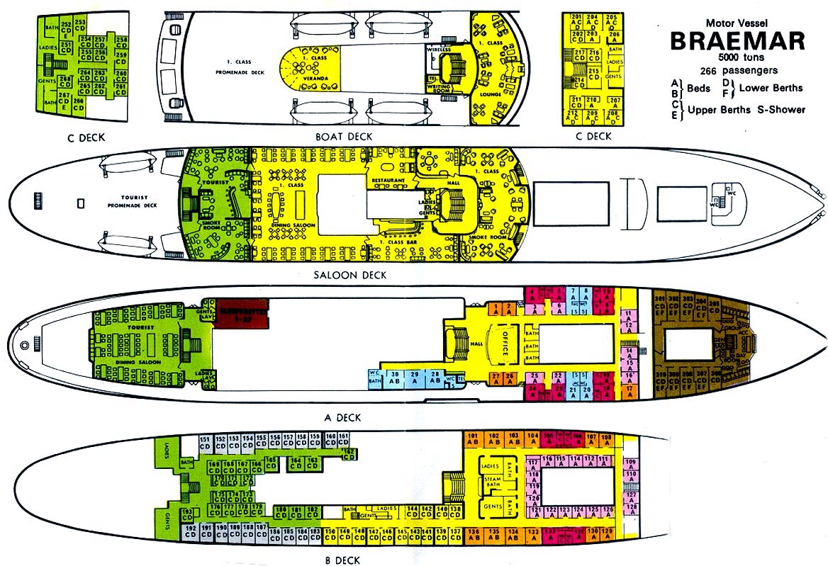 As you will peruse the M/S Braemar’s Deck Plan, you will note that her cabin arrangement is slightly different from her sister. She like her sister also has First Class cabins forward on C Deck, but unlike the Blenheim, the Braemar has Second Class Cabins located aft on C Deck as well. This is because of lesser numbers of cabins on the higher decks, thus making up the numbers of 100 passengers in First Class, and 130 in Second Class. And of course the 36 ‘Group Accommodation’ all male passengers, completely separated far forward on A deck.