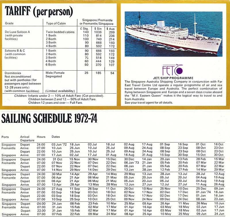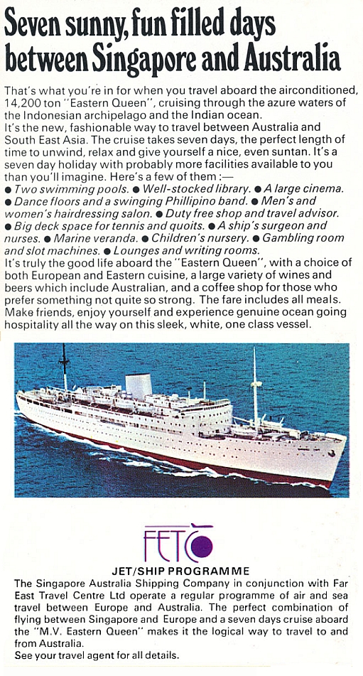 Eastern Queen was placed on the Fremantle, Indonesia Singapore service for the next few years under a charter agreement to Fit Line. Although she was market to operate for single and round voyages, but also the then popular Jet/Ship programs to and from the UK and European destinations, using charter flights from Singapore. This was operated by the Singapore Shipping Company and the Far East Travel Centre Ltd. And it commenced well with the fares for Jet/Ship travel being much cheaper than regular airfares in those days!