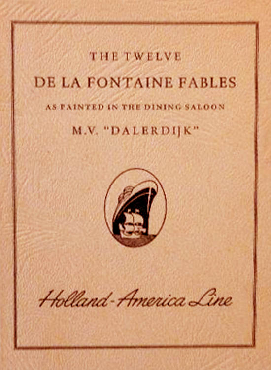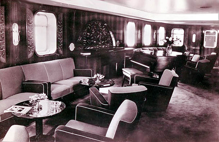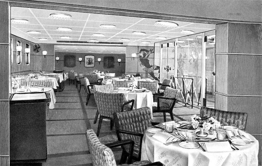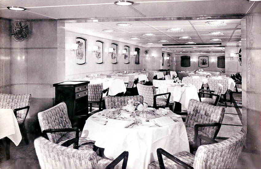 One deck down on B Deck forward of the Lobby and the wonderful curved stairwell was the dining Room that extended the full width of the ship and was bright and beautifully furnished and well known for the sliding window panels that depicted twelve of the “de la Fontaine” famed fables including; “The Crow and the Fox,” “The Hen and her Golden Eggs,” as well as others.