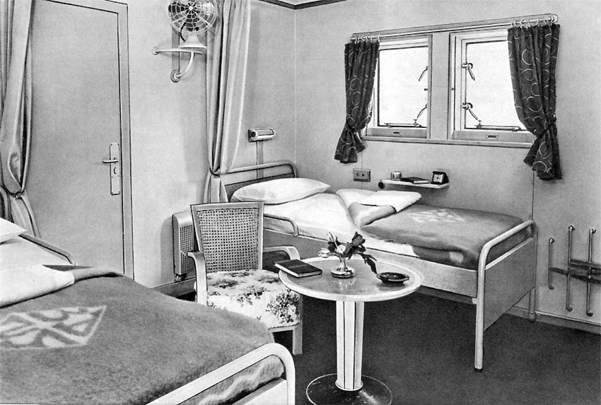 There were sixteen cabins on Promenade Deck, eleven of these where twin bedded cabins, one singe bedded cabin, and four single cabins, but these had a convertible sofa and thus could accommodate a second person. Thus her complement would be based on her normal berths on this deck as 27. Each cabin had one washbasin and a wardrobe per person. The showers and WC were located amidships, with bathtubs aft. However every cabin did have a sofa, but except those mentioned these sofas did not convert.