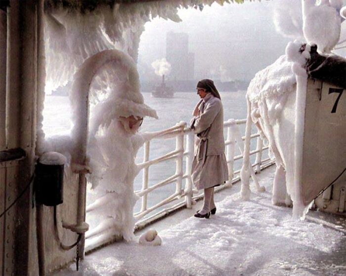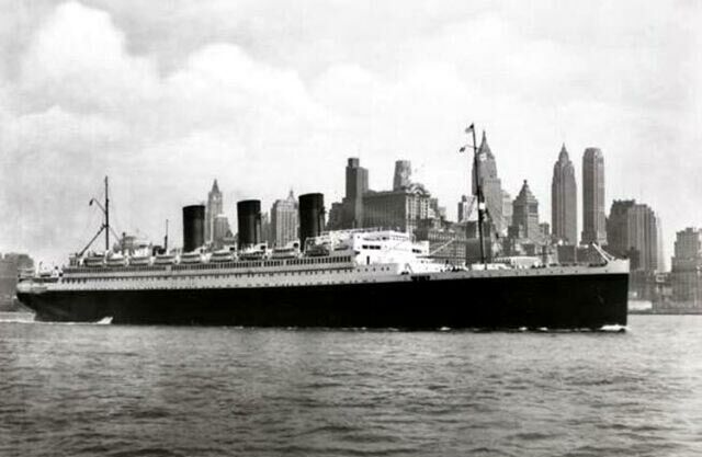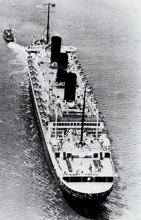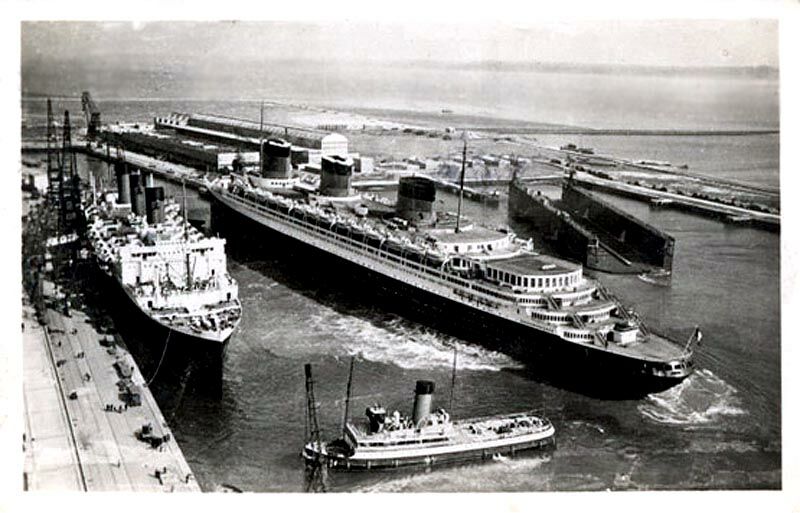 whist the 79,280 GRT, S.S. Normandie is seen departing for