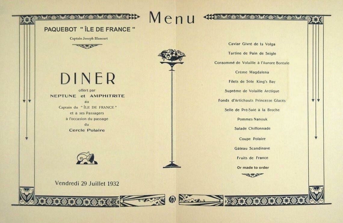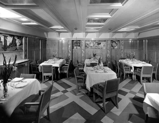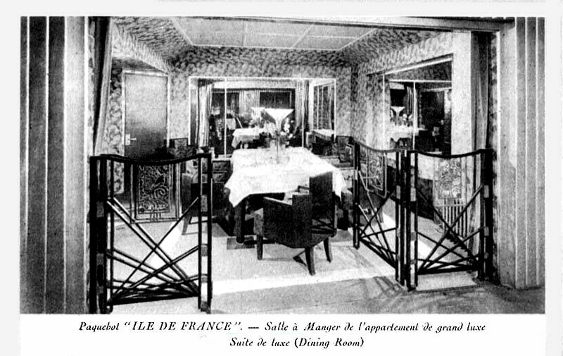 Her fit-out actually followed the opening of the Paris “Exposition des Arts Decoratifs et Industriels Modernes” of 1925, and this great event gave birth to the term “Art Deco” and it obviously inspired “Île de France’s” spectacular décor. Just a few of the army of French artisans who were commissioned to decorate her magnificent interiors were famous names such as; Jean Dunand, Rodier, Jules, Leleu, Le Bucheron, Dupin, Janniot and Pierre Patou.
