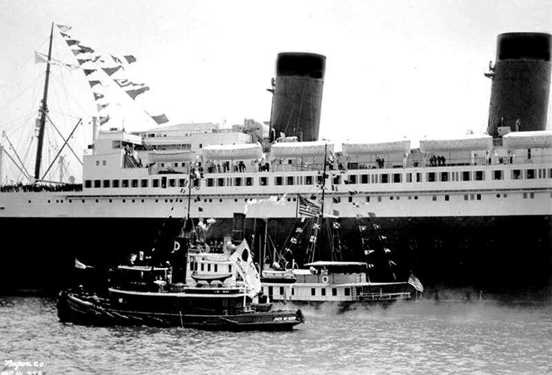 S.S. Île de France is fully dressed with flags, and small boats surrounded her during her arrival