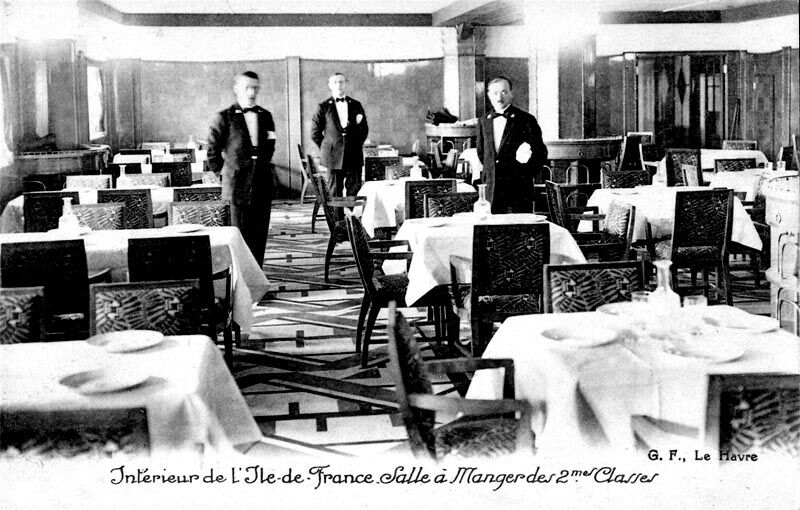 The brand new luxury liner “Île de France” having been introduced in 1927 it was soon realised that she was a very unique and an elegant Liner. Many of the earlier liners so often had their décor in a style that seemed more that it had been copied directly from one of the land based Palaces or a Castles. But the ‘Art Deco’ style of the “Île de France” commenced a brand new trend and soon her style of decor would be suddenly turning up on land, rather than the other way around.