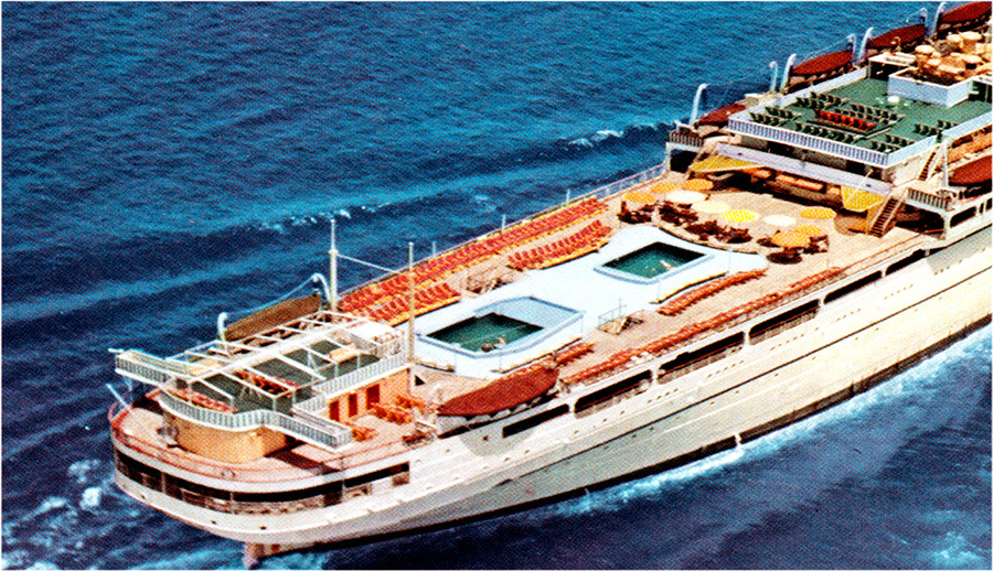 Hone of the special features was that her three aft cargo holds on Upper Promenade Deck were removed which would provide a great deal of additional deck space where two Swimming Pools were installed with a forward Lido terrace, as well as a new aft deckhouse, with a Sun/Sports-Deck above