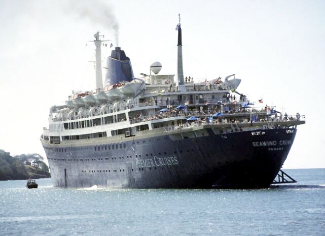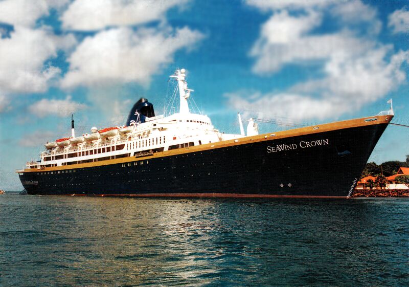 In 1991, Vasco Da Gama commenced on a series of Brazilian cruises, but she was given the additional name of SeaWind Crown (but officially she retained her original name on her bow) as she was under charter to the American “SeaWind Cruise Lines” and they mostly operated week long cruises to Aruba.
