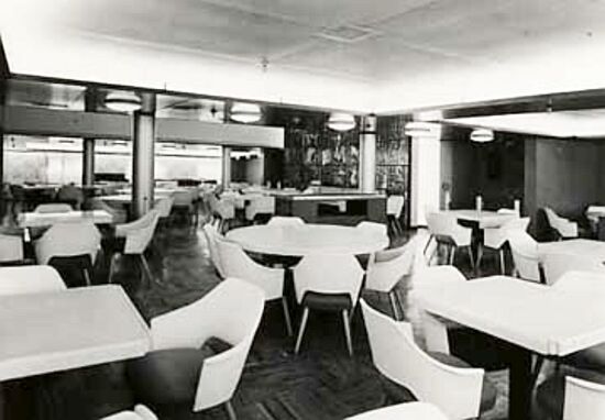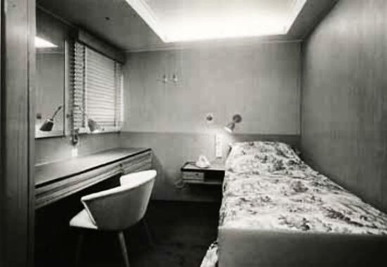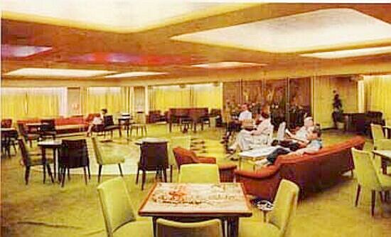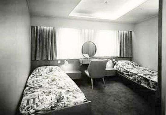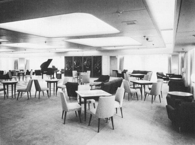 Unlike her earlier sisters the company had decided on some radical changes when they designed this ship, both externally, as she “looked as modern as tomorrow” as the saying went at the time, to even “futuristic.” And her sleek looks and her unusual colour arrangements certainly gave her a new and unusual look! However, it would be her interiors that would see some dramatic changes from the “old times” and she would become a ship with the “new look.” Gone were the dark panelled lounges and the garden verandas. Her First Class although spacious for just 156 privileged passengers, the majority of the ship was made available to the 862 Tourist Class passengers.