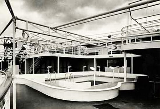 Boat Deck: Forward, one on the starboard, the other on portside, were two magnificent deluxe suites. In addition there were another 36 superior twin and single staterooms all with private facilities. Located just forward of the main stairwell was the chapel, whilst far aft out on deck was the First Class Swimming Pool complete with a bar and the Sun Deck. Whilst the deck above was First Class Sports Deck that ran the full length of the superstructure.