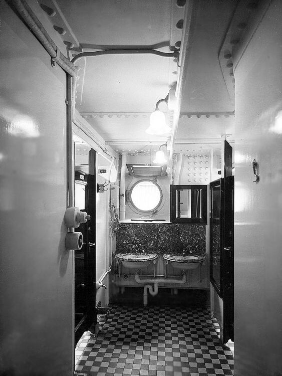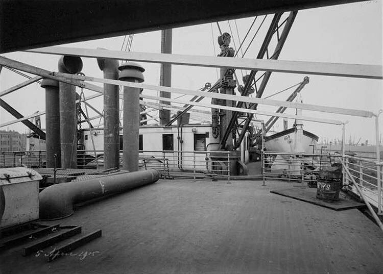 She was in fact completed and as she needed to have certain special touches to be taken care off, it had been decided by S.M.N. to have her taken to their Amsterdam berth, thus as she was not crewed up as yet, on May 20, 1915, she was taken under tow, but strangely she was towed by her stern, and thus the slight list that is seen in the photograph below.