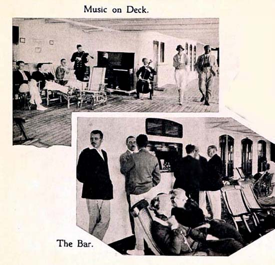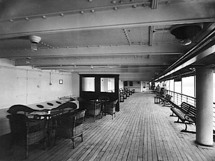 Outside was the spacious Promenade Deck, which was the perfect place to relax outdoors and enjoy full service for stewards who would attend day and in the evening, as well as bring coffee, tea and bouillon in the morning and coffee or tea for afternoon tea, etc. In addition, music would also be performed during he day.