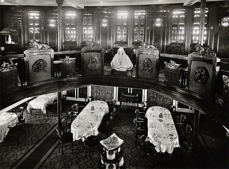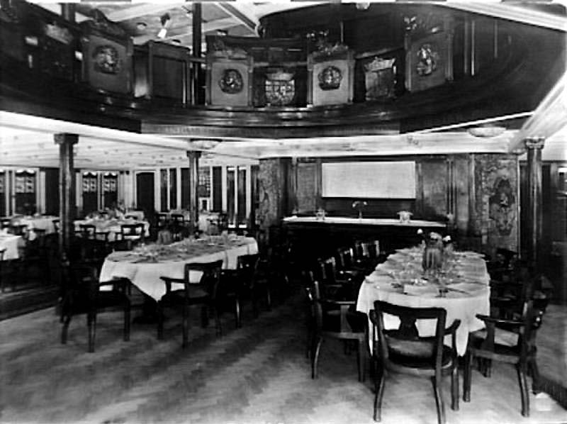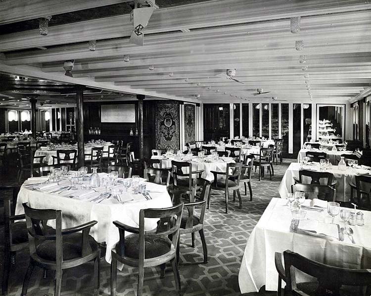 The Dining Room was spacious and offered tables from four to tables for twelve guests. The venue had exceptionally large portholes and room was richly decorated, and like the public rooms the ceilings also had screened silk prints inlaid between the columns.