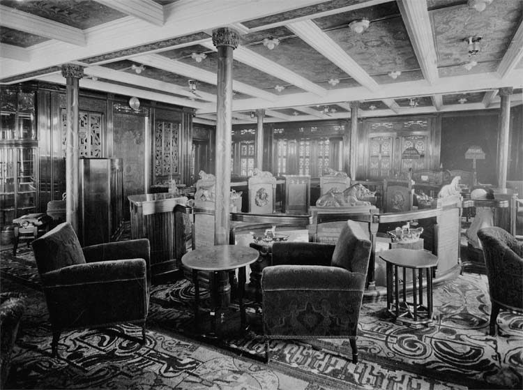 Directly aft of the Main stair well we come to a sublime venue, being the Smoking Room being separated into several sections, and even has different carpets in these, thus differentiating them. One section has the service Bar, and even the ceiling and the lighting is somewhat different. The room features walnut pillars carved at the top and again screened silk prints on the ceilings.
