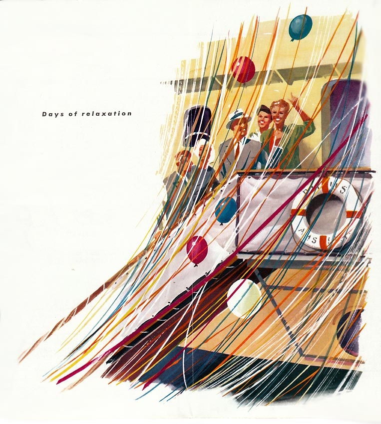 The poster is followed by a brochure from the author’s private collection (like the majority of items shown), which contains colourful illustrations and a 1962 Deck Plan of all three ships, as their layout was identical. Shown are both First and Second Class, but for some reason, Third Class is not shown and it was located far forward in the bow section.