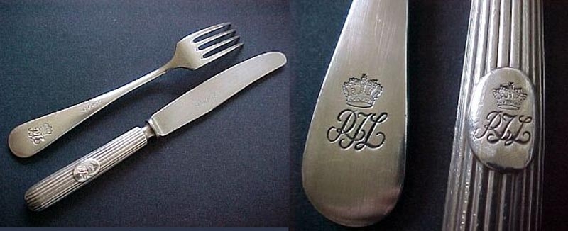 see a stainless steel RIL fork and knife set with the RIL logos on the front and the back