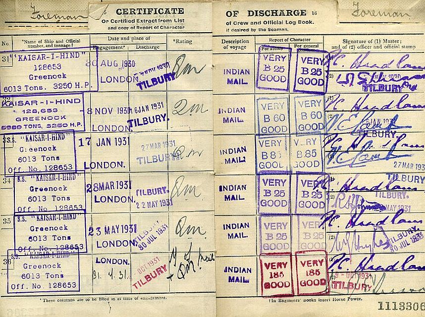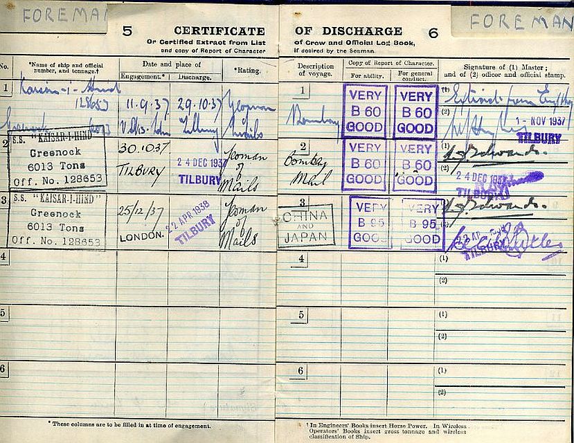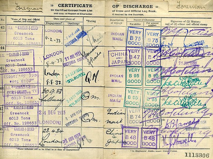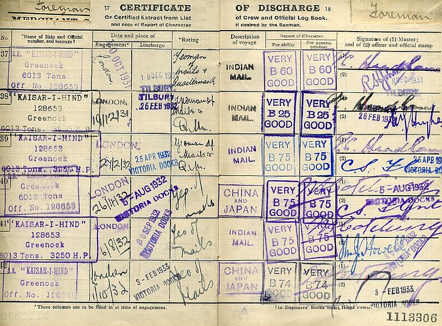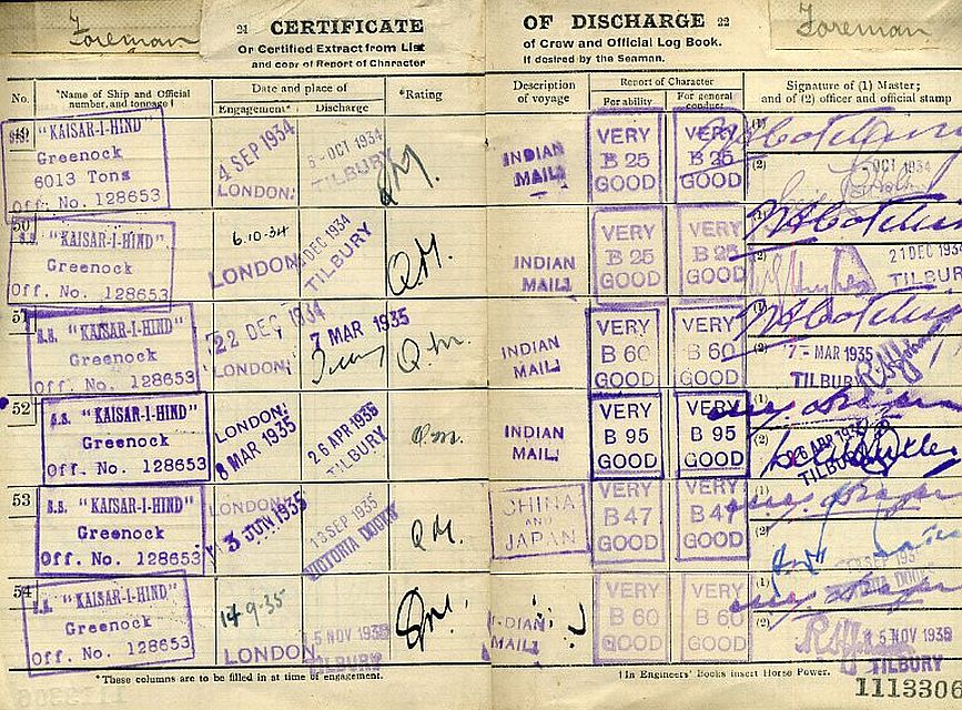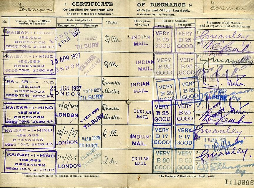 The above is an amazing record of William’s seagoing life and I am most grateful to his son Trevor Foreman for sending his Father’s “Discharge Book” and the other material fir it certainly enhances the RMS Kaiser I Hind story greatly!