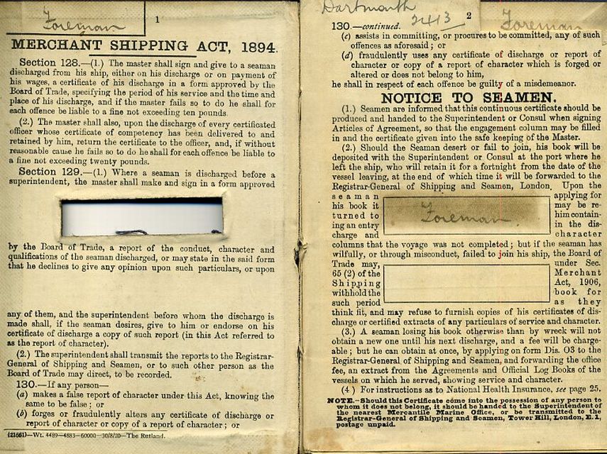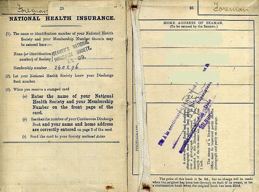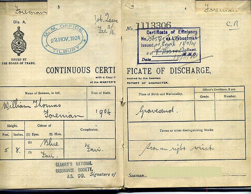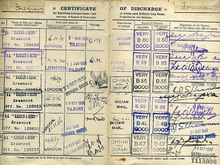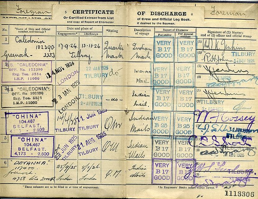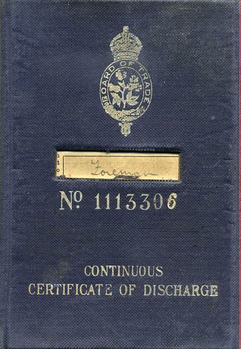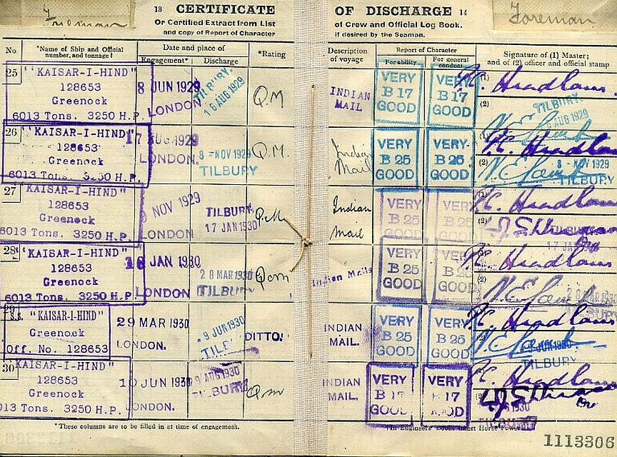 The above is an amazing record of William’s seagoing life and I am most grateful to his son Trevor Foreman for sending his Father’s “Discharge Book” and the other material fir it certainly enhances the RMS Kaiser I Hind story greatly!