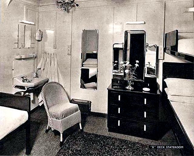 B Deck contained the medical centre as well as further accommodations, madder up of 2,3 and 4-berth cabins, all having a porthole aa well as a wash table with hot and cold water.