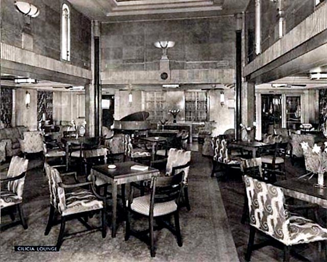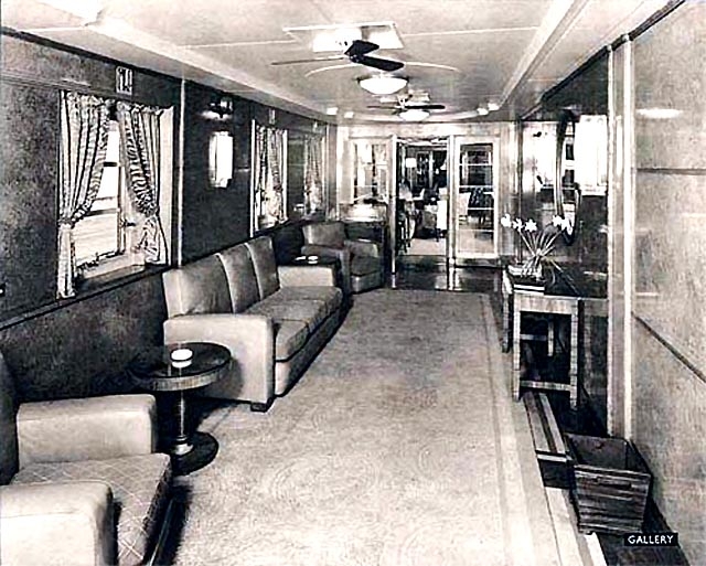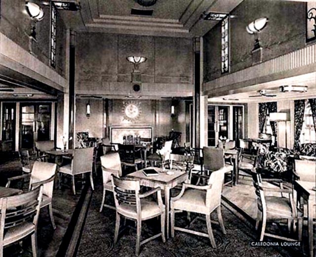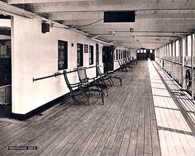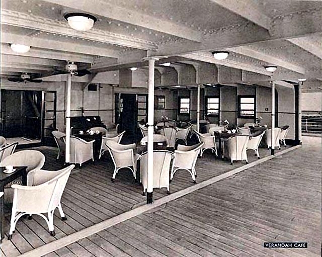 Promenade Deck contained all the ships Lounges, the Main Lounge, the Lobby, the Long Gallery, Reading and Writing Room, as well as a library. Aft was the very popular Verandah Café offering views over the aft of the ship.