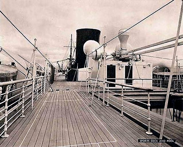 Sports/Sun Deck offered extensive space for spots or sun baking as well as the Swimming Pool aft of the funnel.