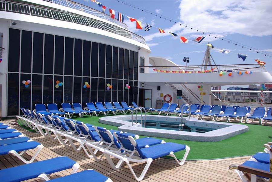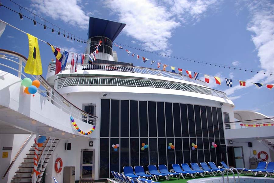 we see the Pacific pool aft of the ship and looking forward we see the huge