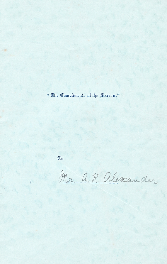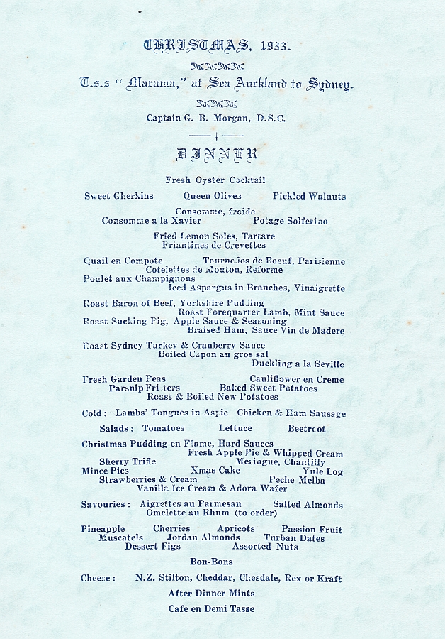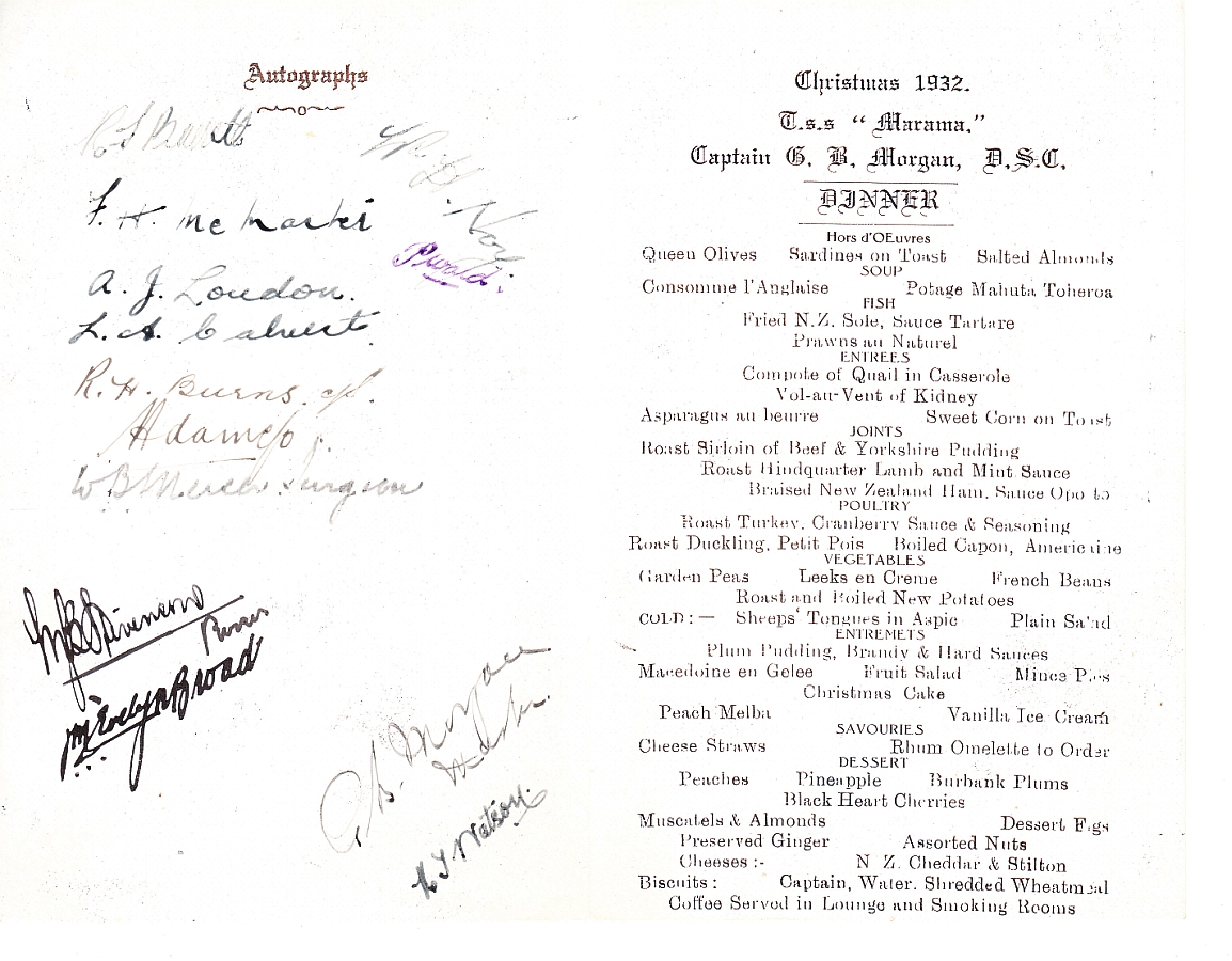Christmas Menu for `1933, including Keith’s signature on the inside front