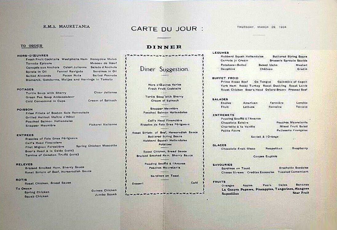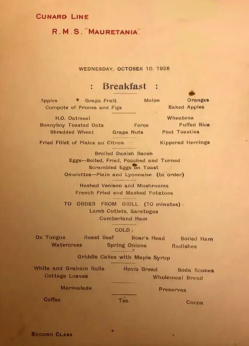 First Class obvious was able to serve full a’ la Carte meals in certain suites and staterooms as the “Rergal Suite”, not only had Parlor (Lounge), but also a Dining Room as well as two bed rooms and many other facilities. Two waiters and a stewardess would be and provide a full service, with individual courses arriving fresh and hot! A wine waiter would be in attendance separately to attend to the gests need for wine, etc.