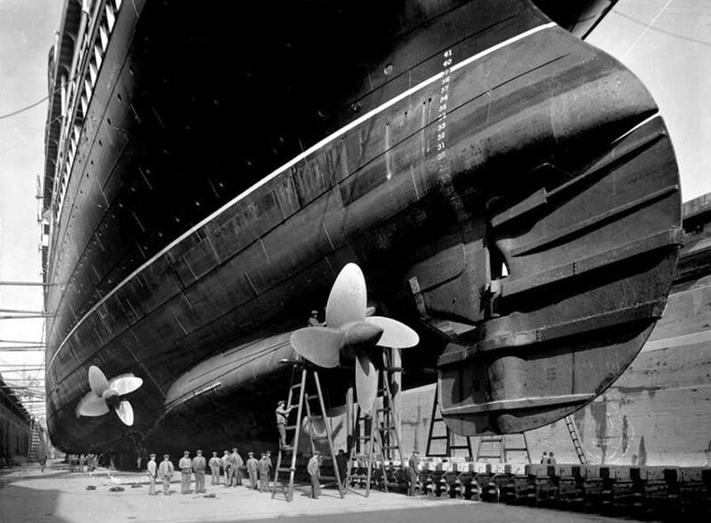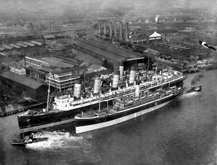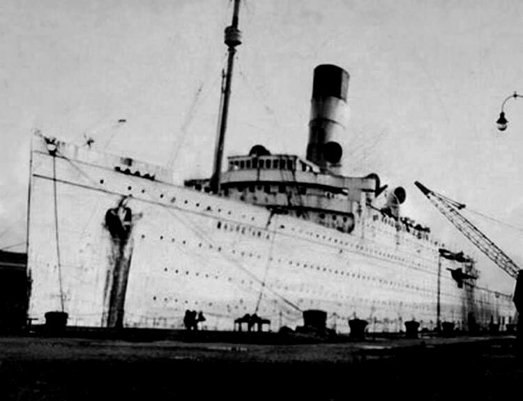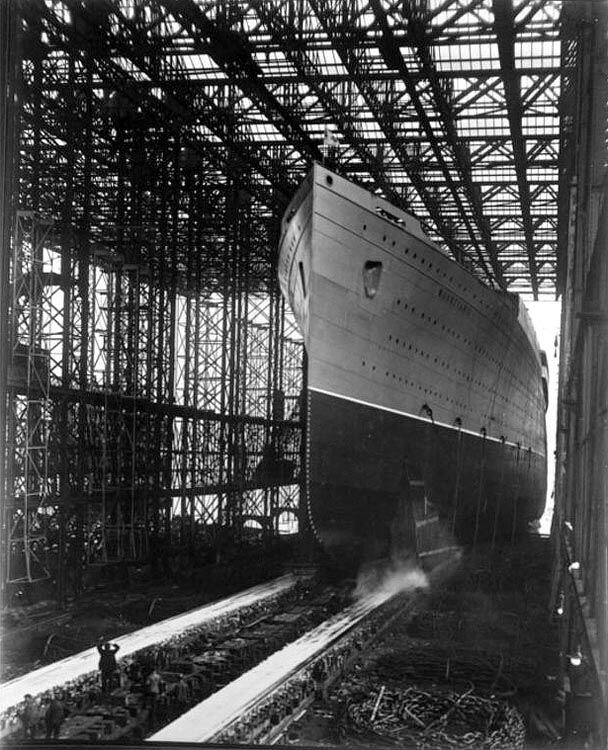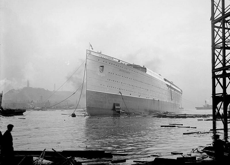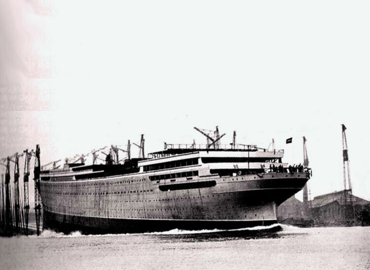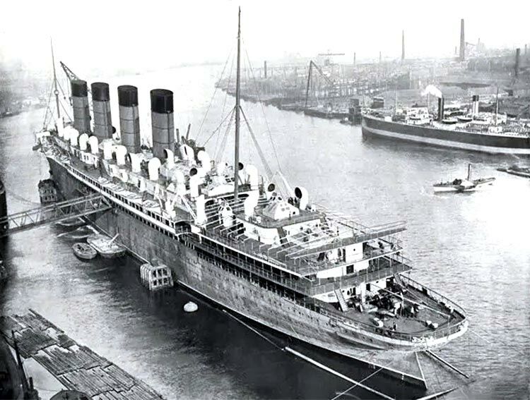 She is seen at her fit-out berth with funnels installed and some of her first lifeboats fitted