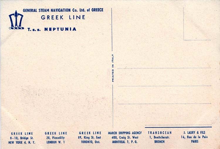 “Greek Line” and she was renamed the T.S.S. Neptunia.