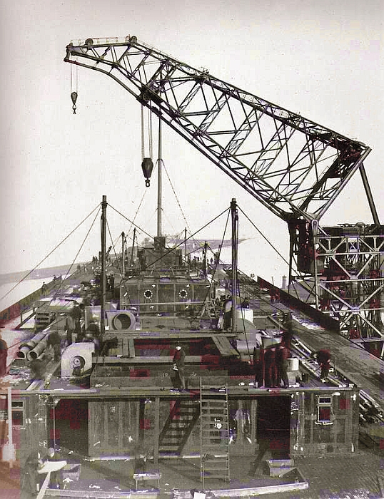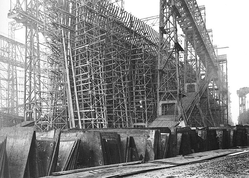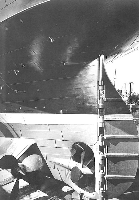 Notes regarding the Photograph above: The diameter of the two outer propellers were - 7m - 23ft, whist the middle one, being the smaller one at 5.18m - 17 ft. The ships rudder was 78 feet 8 inches (23.98 m) high and 15 feet 3 inches (4.65 m) long, weighing over 100 tons, that it required steering engines just to move it. It was constructed by the Darlington Forge Company, Ltd., and was of the elliptical type, of solid cast steel, built in five sections.