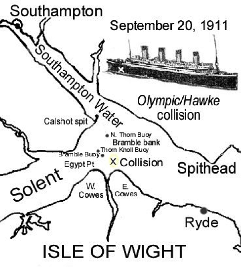 By September 20, 1911 RMS Olympic had already completed four return Trans Atlantic voyages and all had gone well and she had been the great success as expected. However, as she departed on her next voyage on that day things were to change her perfect run, for just as she was turning at Bramble Buoy and Egypt Point she was suddenly met by another ship, the HMS Hawke!