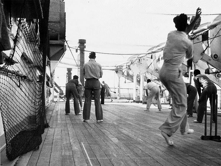 Games Deck is seen port side aft with a game of Cricket going on as well as another game further aft