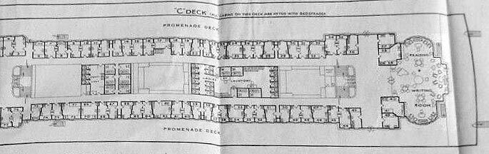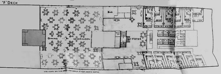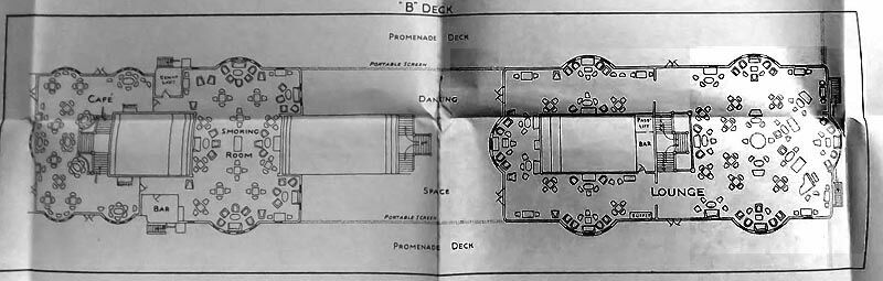 As always I will commence from far forward and the top of the ship, and then slowly head aft and go down deck by deck. Although she was a two class ship, sadly I only have what would have been her First Class venues, and the Deck Plan I do have of her is a 1926 Cruise Plan, which is of course a One Class Plan where the Third Class Dining Room became the “Ball Room”.