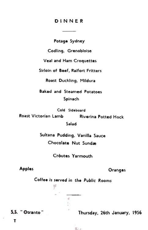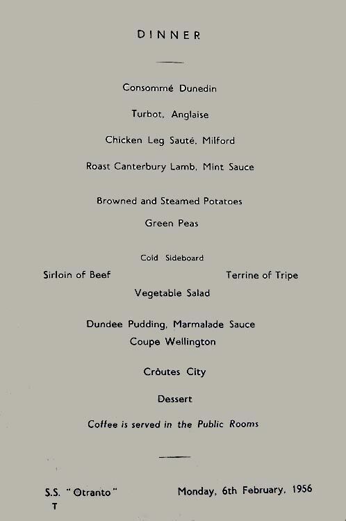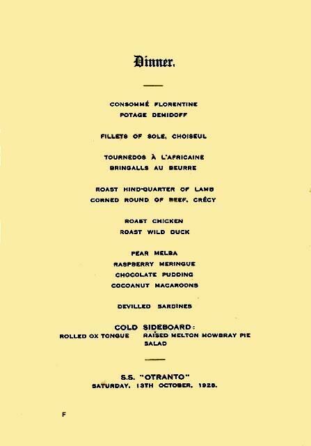 Then on January 9, 1926 the magnificent looking R.M.S. Otranto was filled with many happy people, although there were also those who were migrating so far away and they felt rather nervous, for they were leaving behind so many loved ones, and it was a huge step they were taking! But as the band played, it somehow brought a feeling of relief and joy to the occasion as she finally pulled away from the wharf and the last farewells were shouted, and finally as the ship had well left the port, every one either had returned to their cabins or went into one of the fine lounges on this beautiful ship for a drink and meet some of their fellow passengers! Thankfully dinner was also about to be served and that would be something to look forward to!
