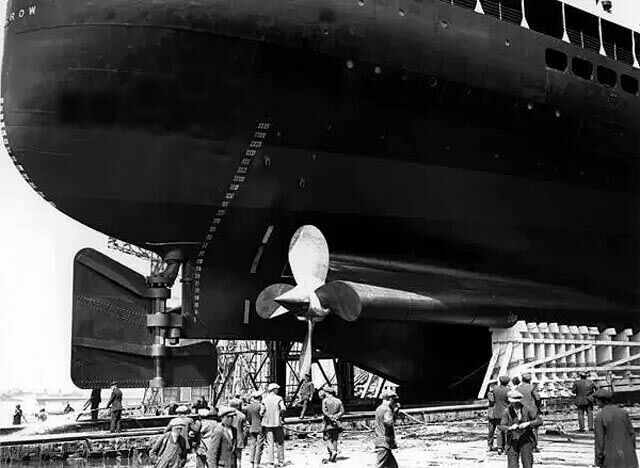 Above & below: two images of her stern, one was taken just after her propellers were fitted