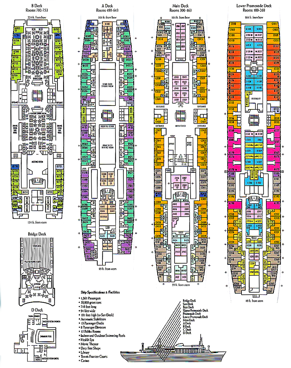 This completes the First Class Deck plans from Observation Deck down to D Deck. Obviously Promenade Deck is not shown, as it is entirely devoted to Tourist as we will see below!