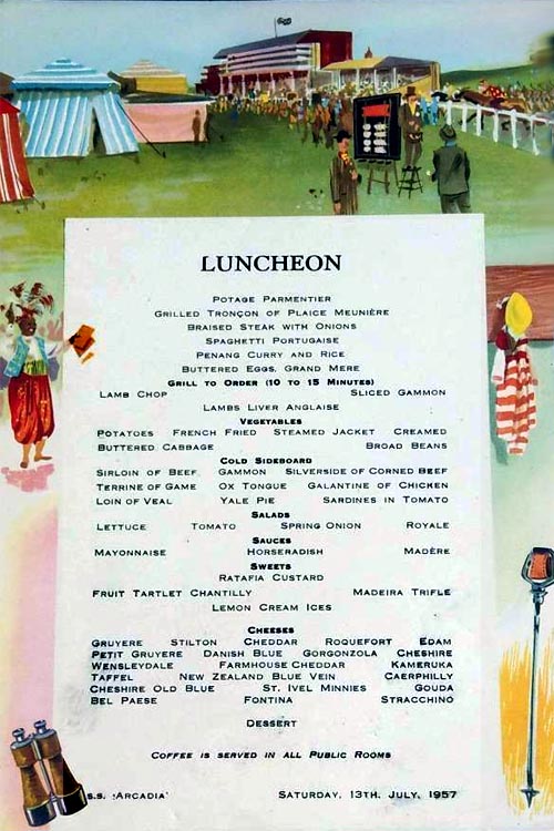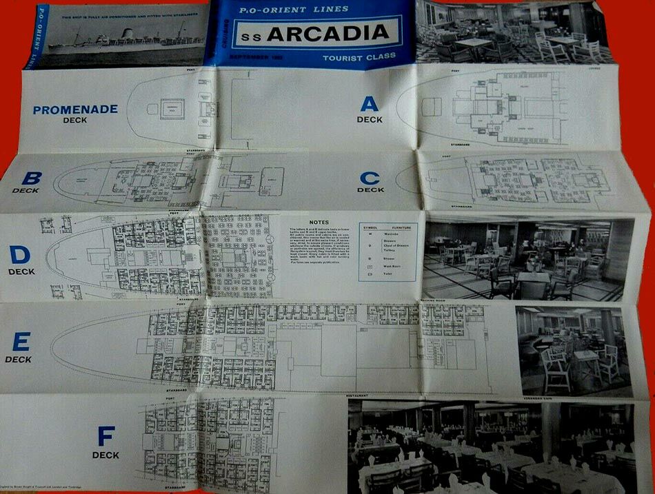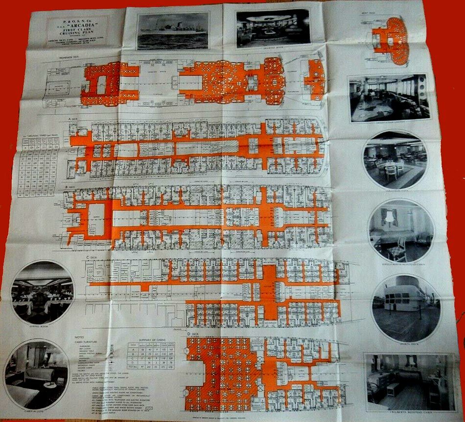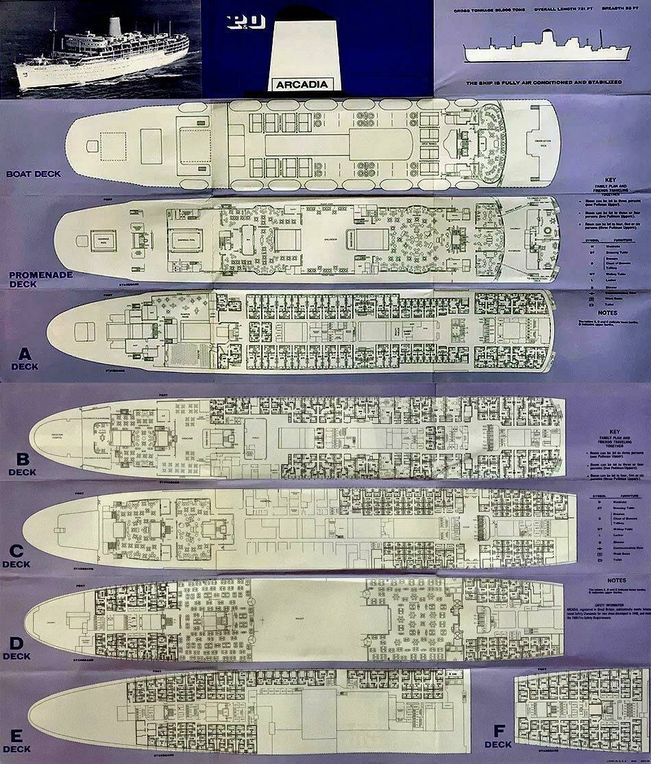 On this page you will find Deck Plans, Menus, as well as items of S.S. Arcadia’s Souvenirs and Memorabilia, but most importantly towards the bottom of the page you will find all the Ships “Specifications & Details”.
