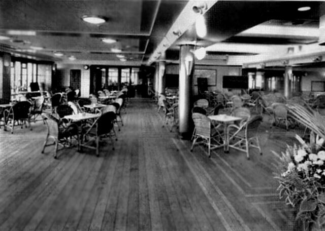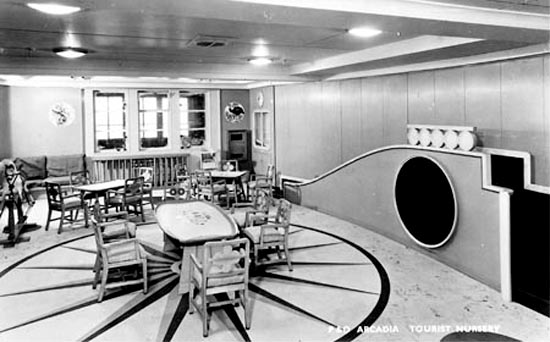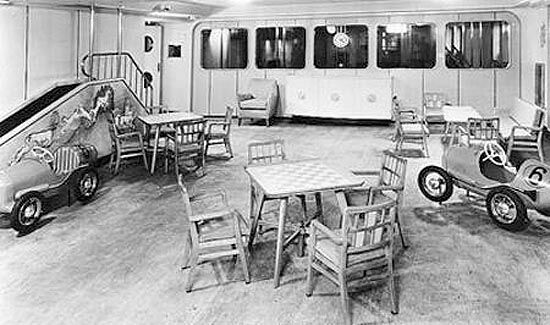 The Playroom is divided by a wall with five windows in it, into two separate spaces for this enables the hostess to separate children of different ages, the starboard section was for the younger set, and the port side for those that were somewhat older. WC facilities were available for the children and outside the play area was retained to the middle of the deck. This was done so that passengers could reach the “Observation Deck” or use the front stairs to the Boat Deck.