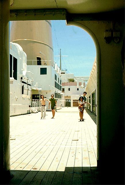 This venue was without a doubt a large venue, and like on all P&O ships it was decked with teak timber, the same as the exterior decks, and the sides were the folding timber framed glass screens that could be opened during fine weather, or kept shut. The Musicians platform was located at the forward end between the two entrances. Also forward but on the starboard side was the steward service only Bar that serviced the Lounge, Ballroom and the deck outside when passengers were relaxing there.