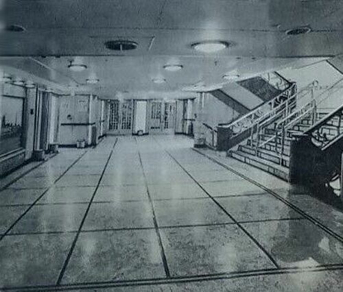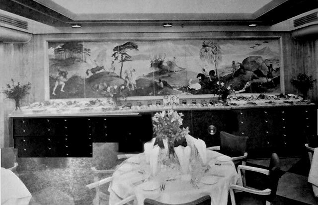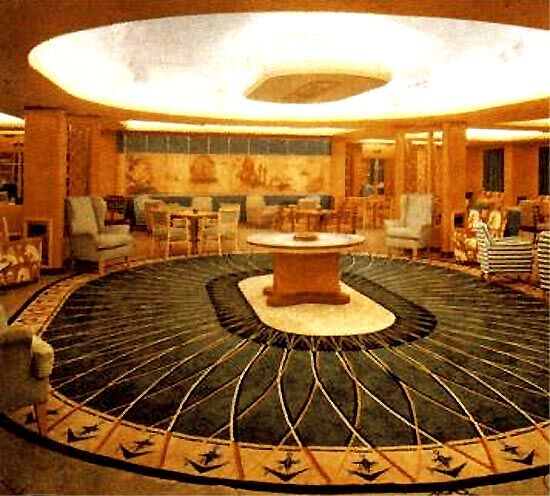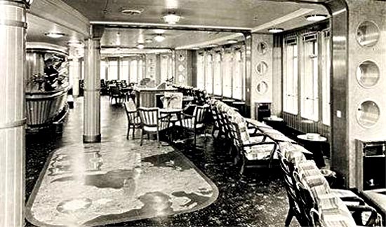 This beautiful venue served as the first Class Main Bar as well as the Smoking Room. It had two wide bay windows, with panelled, pillared surrounds, which were outstanding features of the room. The centrally located Bar faced forward to a decorative panel representing a chart of the world.