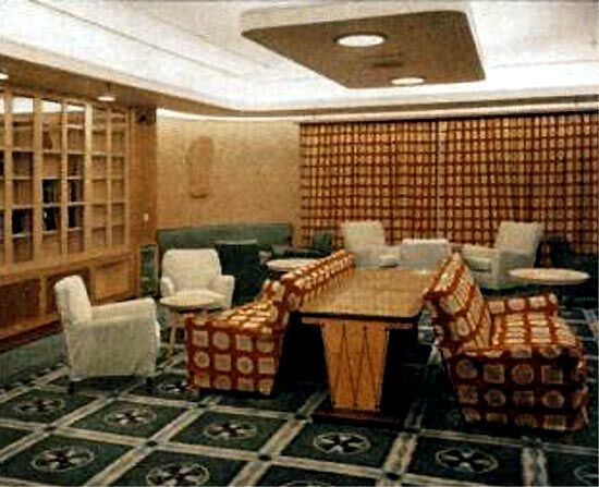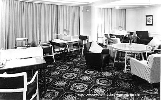 The Writing Room were of course enclosed venues and its furnishings were of sycamore and walnut, and there were single and double writing desks, with occasional tables and chairs. Whilst the colour scheme was the same as the Library.