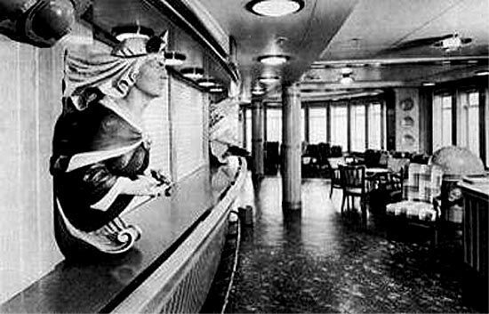 Large tall windows were set in the in the forward and rounded side bulkheads of the venue providing sensational views. Along the windows there were comfortable armchairs each having footrests. In the center of the venue on the aft bulkhead was the Bar and it was decorated on both sides with a large figurehead being a traditional representation of those that used to be betted on old day sailing ships.